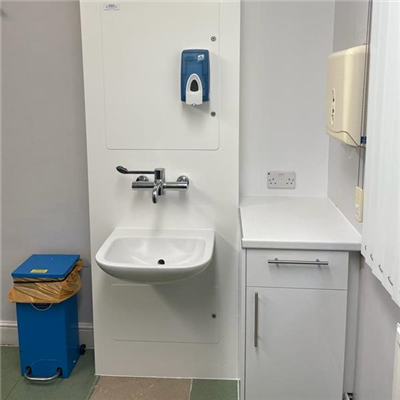 360 stripped out and installed new HTM64 compliant wash hand basins in 1-14 consulting rooms at The Cheam GP Centre.